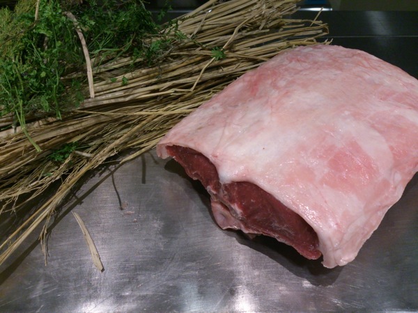 仔羊の鞍下肉の塊と藁や香草を詰めて、
